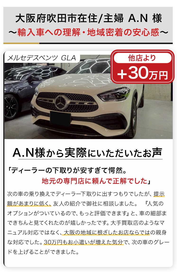 A.当社は輸入車専門の独自仕入れルートを持っており、一般的な買取店より高値で買い取れる可能性があります。ぜひ査定比較をしてみてください。