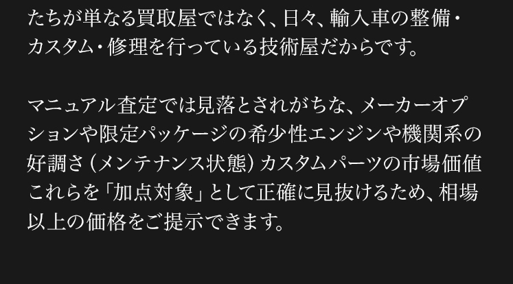 当社は輸入車専門として、車種・グレード・装備・最新の市場相場まで細かく見て査定を行います。