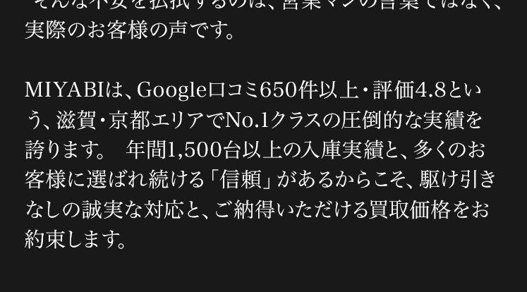 また、「今すぐ売らない」「相場を知りたい」「他社と比較したい」といった場合でも歓迎しております。無理な営業やしつこい連絡は一切行いませんのでご安心ください。